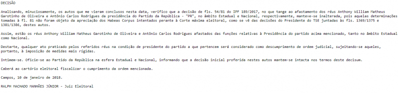 Com isso, "qualquer ato praticado pelos referidos réus na condição de presidente do partido a que pertencem será considerado como descumprimento de ordem judicial, sujeitando-se aqueles, portanto, à imposição de medidas mais rígidas".