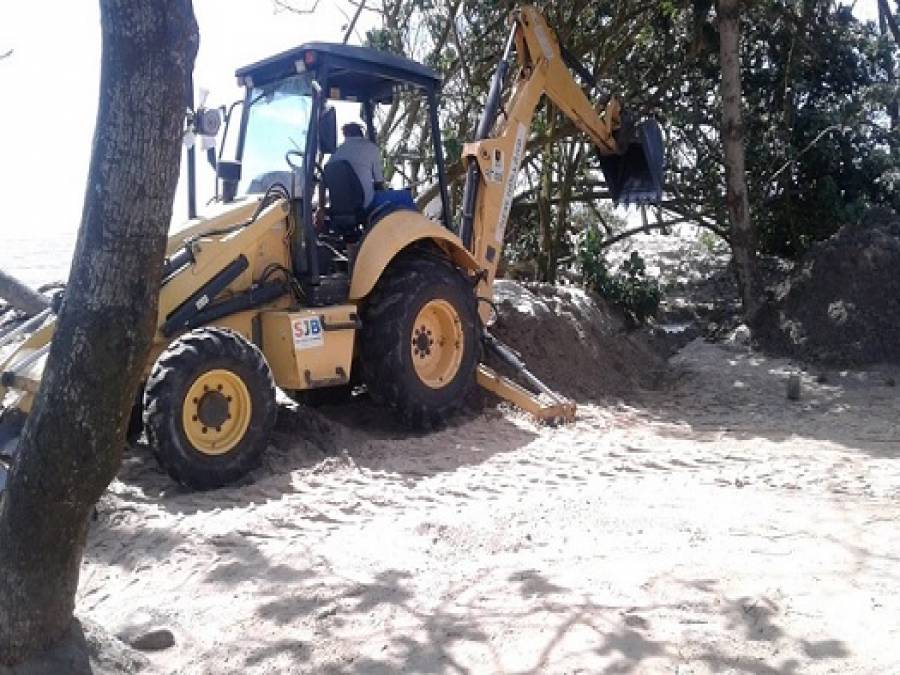 Na área, a Defesa Civil também foi feita a recolocação de dunas com a areia escavada da vala de contenção. Um caminhão de areia também foi providenciado para completar o restante do trabalho. A intenção é, com essa areia, formar um dique de contenção.