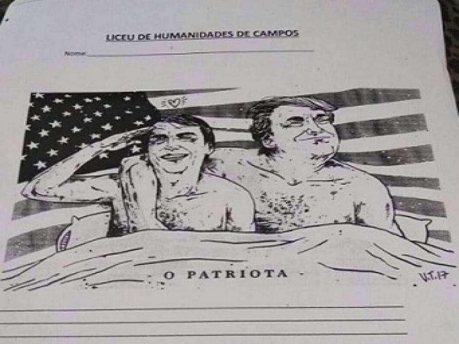 A charge usada na atividade dada pelo professor está disponibilizada no site Humor Político desde 2017 e nela estão ilustrados o presidente do Brasil, Jair Bolsonaro, e o presidente dos Estados Unidos, Donald Trump, embaixo de um lençol. Além disso, a bandeira norte-americana é o pano de fundo da imagem que, segundo o professor, poderia representar a subserviência do Brasil em relação aos Estados Unidos.