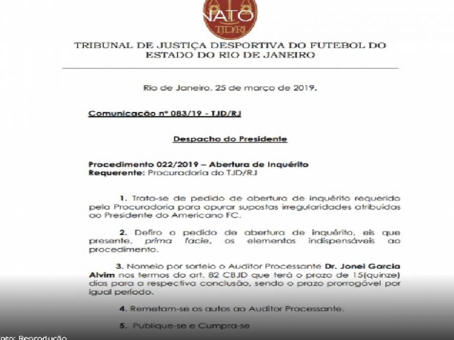 Até o momento, cinco pessoas foram chamados para prestar depoimento.O Tribunal de Justiça Desportiva do Rio de Janeiro (TJD-RJ) pediu abertura de inquérito para investigar a participação de árbitros na manipulação de resultados do Campeonato Carioca. A denúncia foi feita pelo presidente do Americano, Carlos Abreu, após o clube perder para o Boavista, na quarta rodada da Taça Rio por 1 a 0.