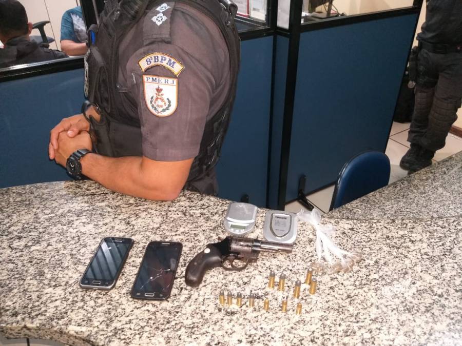 Os policiais foram até o endereço e encontraram um revólver cal.38, cinco munições de calibres 38, sete munições de calibres 32, quatro buchas de maconha, uma balança de precisão e dois celulares.