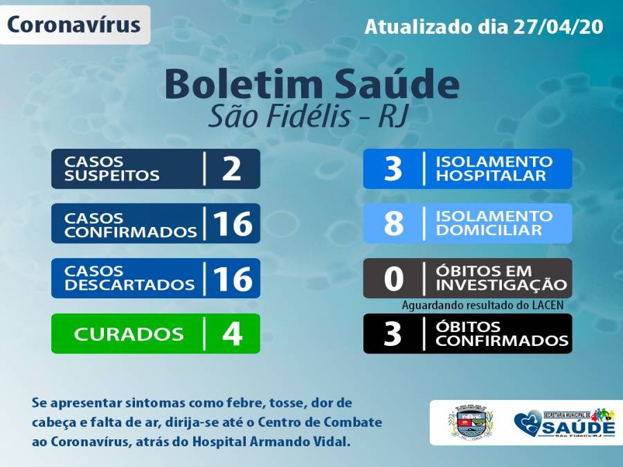 A prefeitura de São Fidélis divulgou na tarde desta segunda-feira (27/04) o aumento considerável dos casos confirmados, passando de 6 para 16. De dois casos curados e passaram a ser quatro.