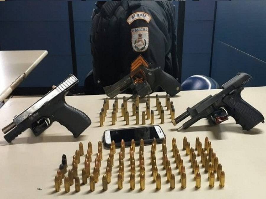 A Policia Militar fez buscas e conseguiram deter o homem e o adolescente com duas pistolas calibre 9mm, um revólver calibre 38 e 132 munições. Os suspeitos, as armas e munições foram encaminhadas para a 146ª Delegacia de Guarus, onde a apreensão foi registrada.