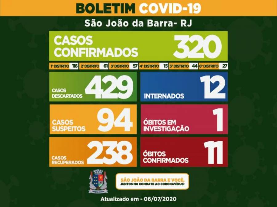 São João da Barra registrou oito casos de coronavírus nas últimas 24h, totalizando agora 320. Estão incluídos neste número 238 pacientes recuperados, sendo oito neste último boletim, e 11 óbitos.