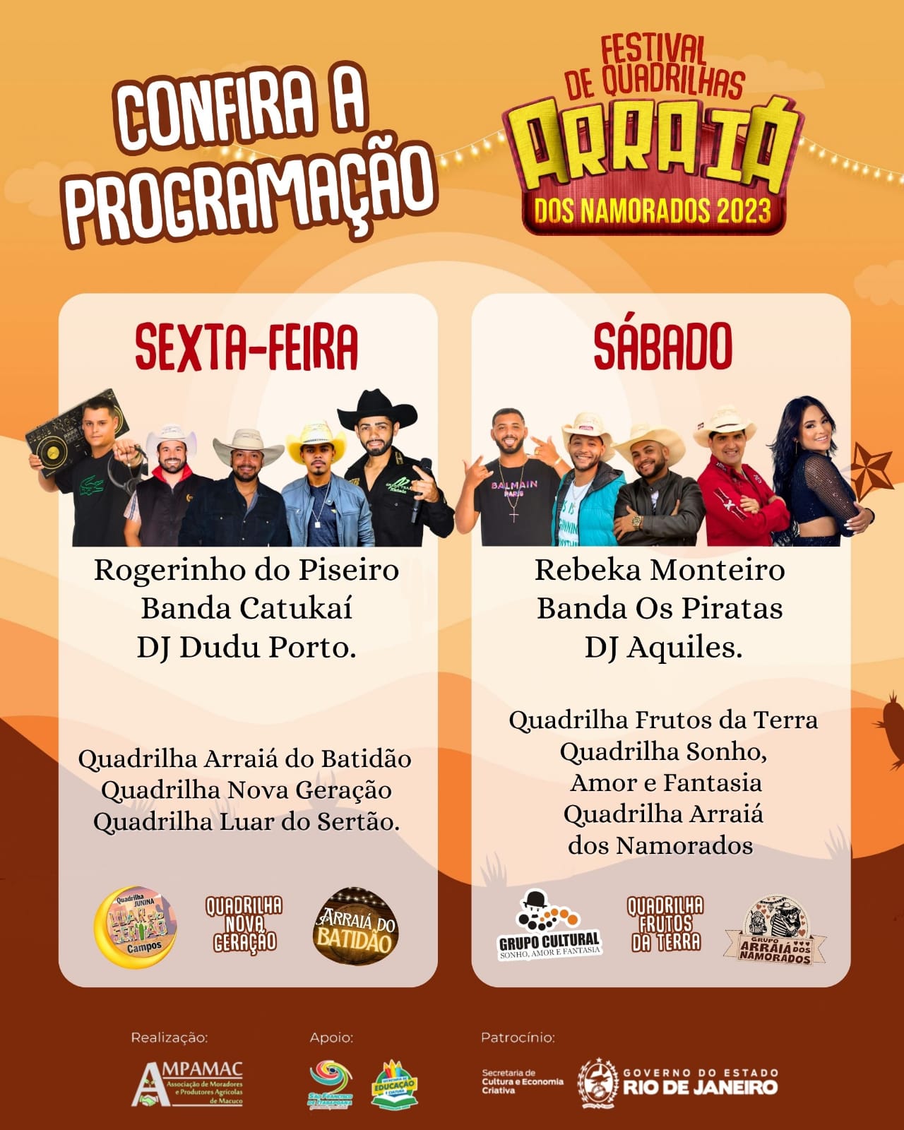 Na programação do primeiro dia, shows com Rogerinho do Piseiro, Banda Catukaí, o Terremoto do Forró, e DJ Dudu Porto, além de apresentação das quadrilhas Arraiá do Batidão, Nova Geração e Luar do Sertão. Já no sábado, as atrações são Rebeka Monteiro, Banda Os Piratas e DJ Aquiles, e as quadrilhas Frutos da Terra, Sonho, Amor e Fantasia e Arraiá dos Namorados.